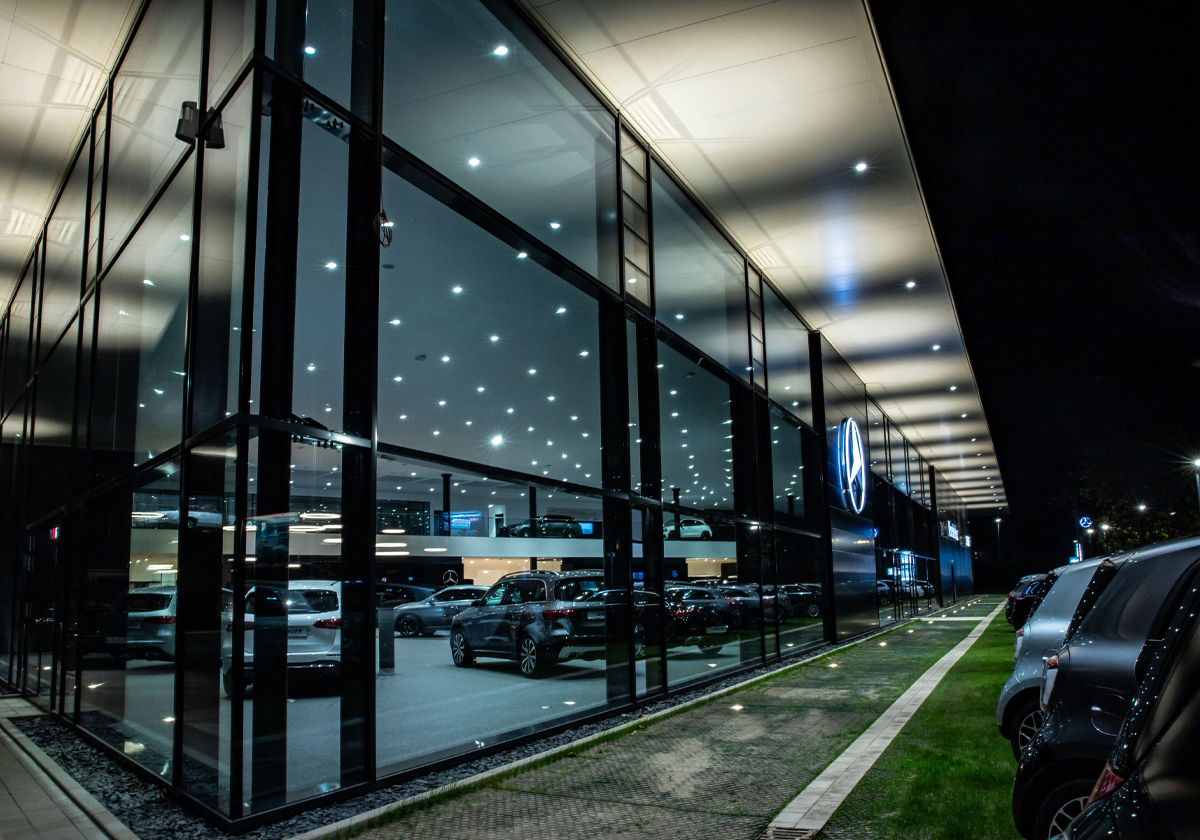 Beginnend mit der Außenbeleuchtung, die die moderne Architektur des Gebäudes perfekt unterstreicht, wird die Aufmerksamkeit der Passanten vor allem in den Nachtstunden auf das Gebäude und die Fahrzeuge gelenkt.
