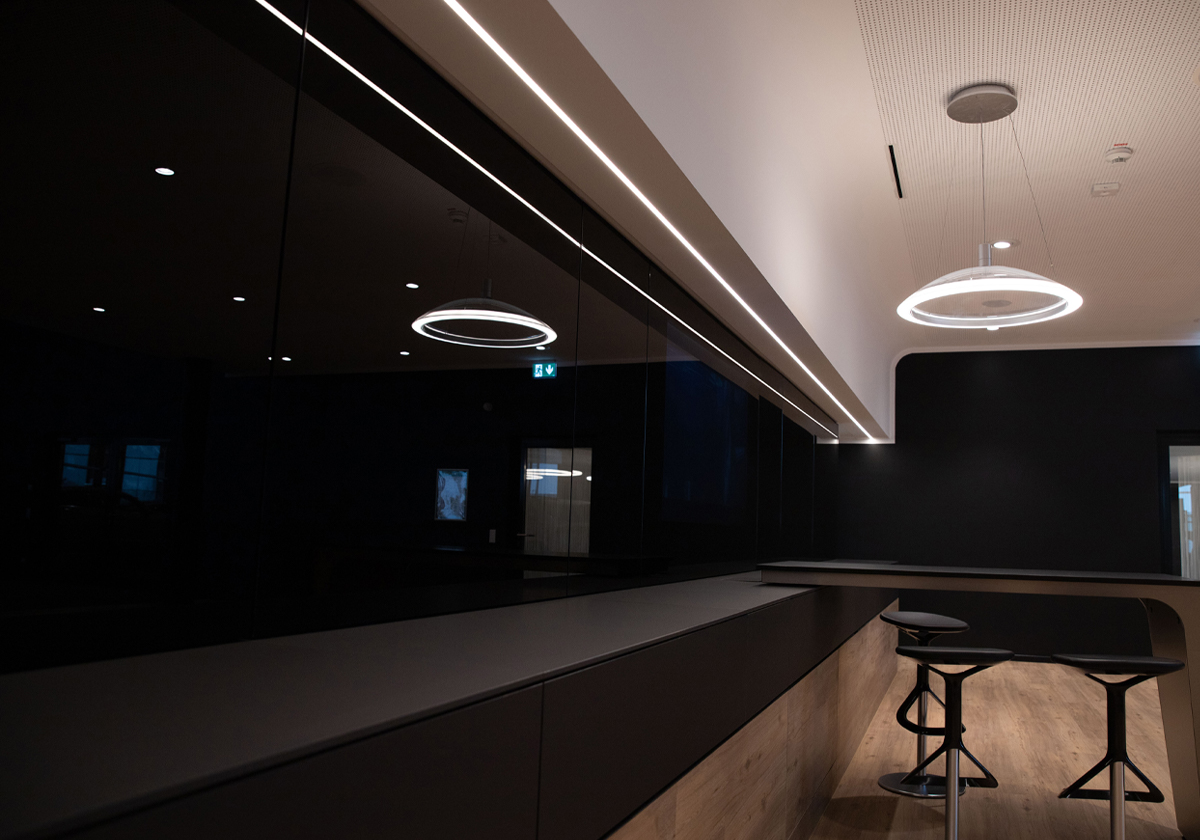 Wer täglich mehrere Stunden am PC im Büro arbeitet, benötigt die richtige Beleuchtung. Eine produktive, gesunde und blendfreie Arbeitsatmosphäre in den Verkaufs- und Beratungszonen des Autohauses schaffen die ASTI LED-Leuchten der Herstellers Architech sowie die GLOS Pendelleuchten und runden TAKEO Downlights von NEKO Lighting.