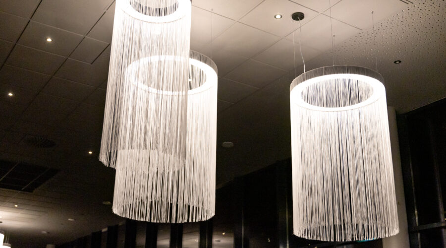 Der Eingangsbereich erstrahlt mit den beeindruckenden Pendelleuchten Ringo Star Chandelier von Lightnet, die durch ihre außergewöhnliche Optik zu echten Blickfängern werden und dabei viel Licht spenden.