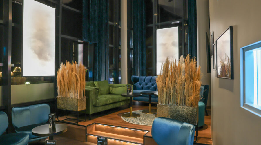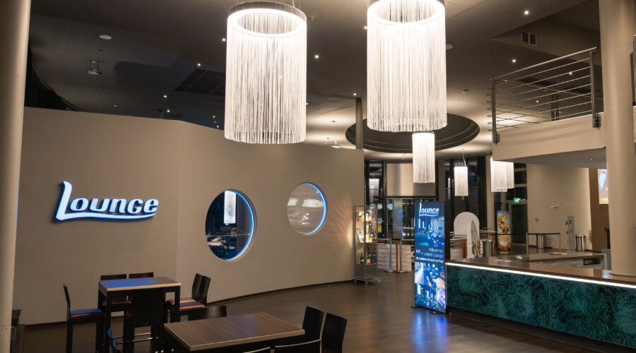 Die blauen Lichtakzente in den verschiedenen Sitznischen der Lounge schaffen eine einladende und gemütliche Atmosphäre.
