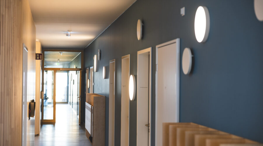 Das Arona-Downlight von Architech sorgt mit seinem sanften Licht für eine warme, einladende Stimmung. Die schlichten runden Basic-Leuchten von Lightnet GmbH bieten auf den Fluren Sicherheit und Orientierung.