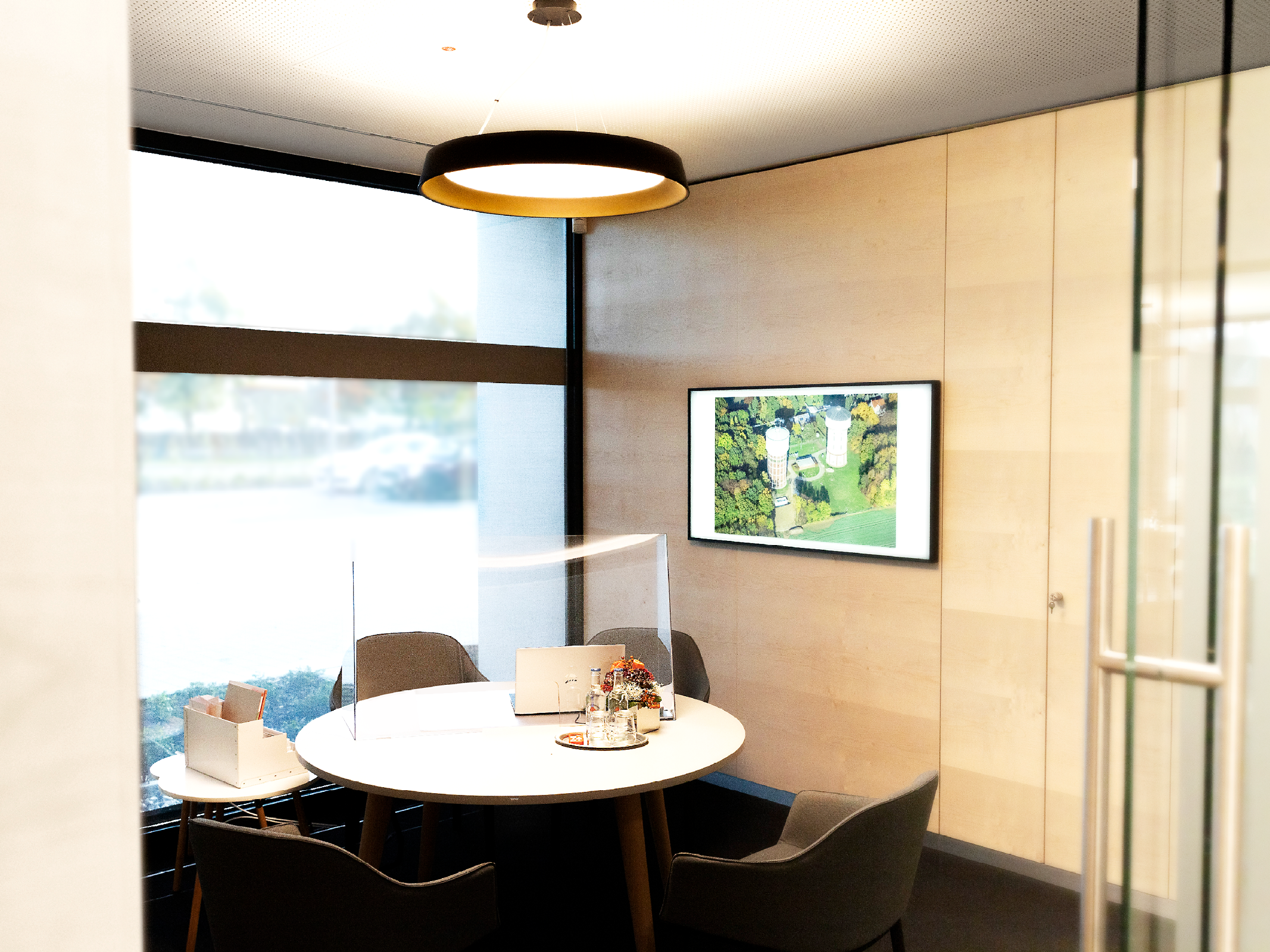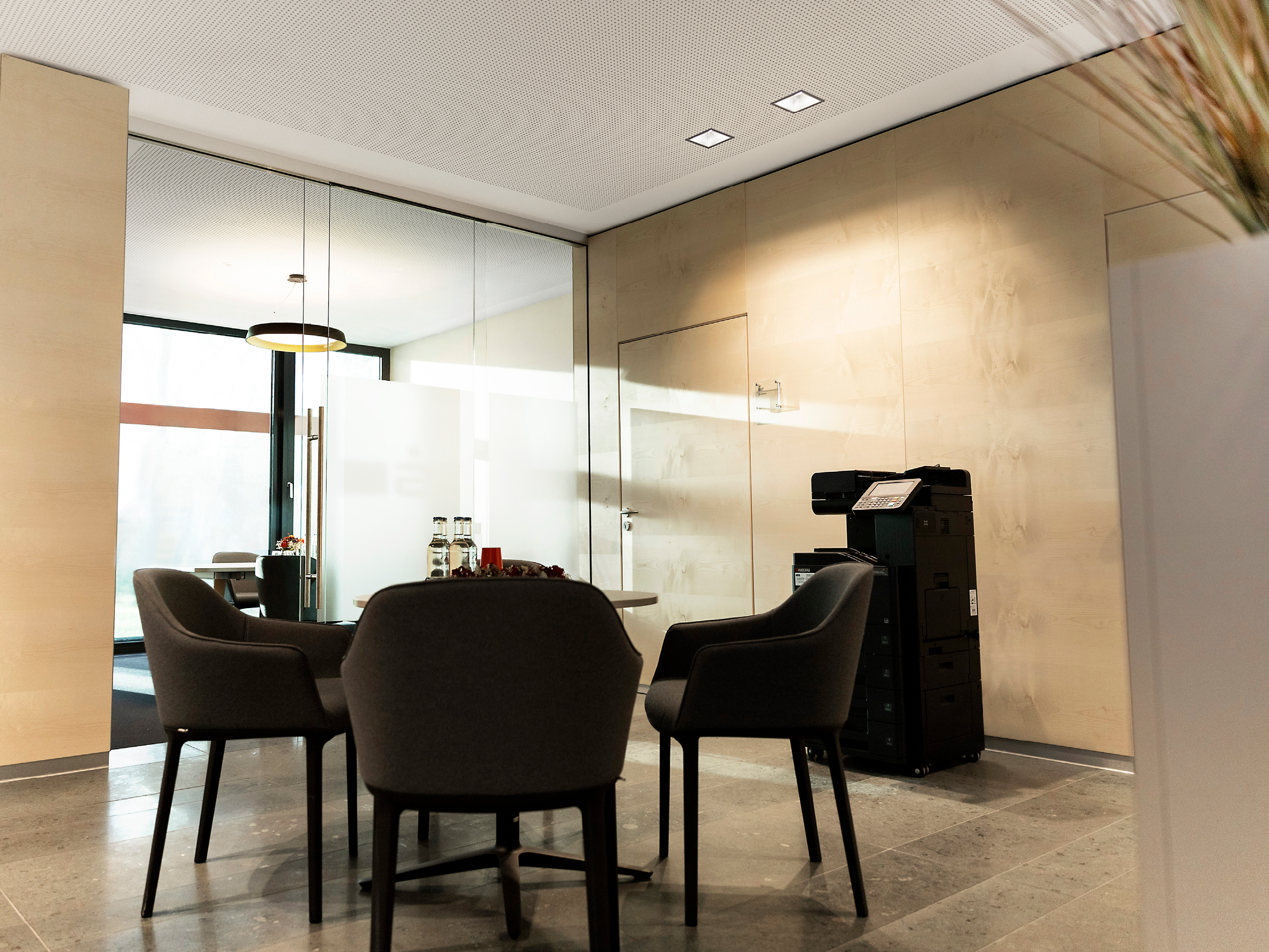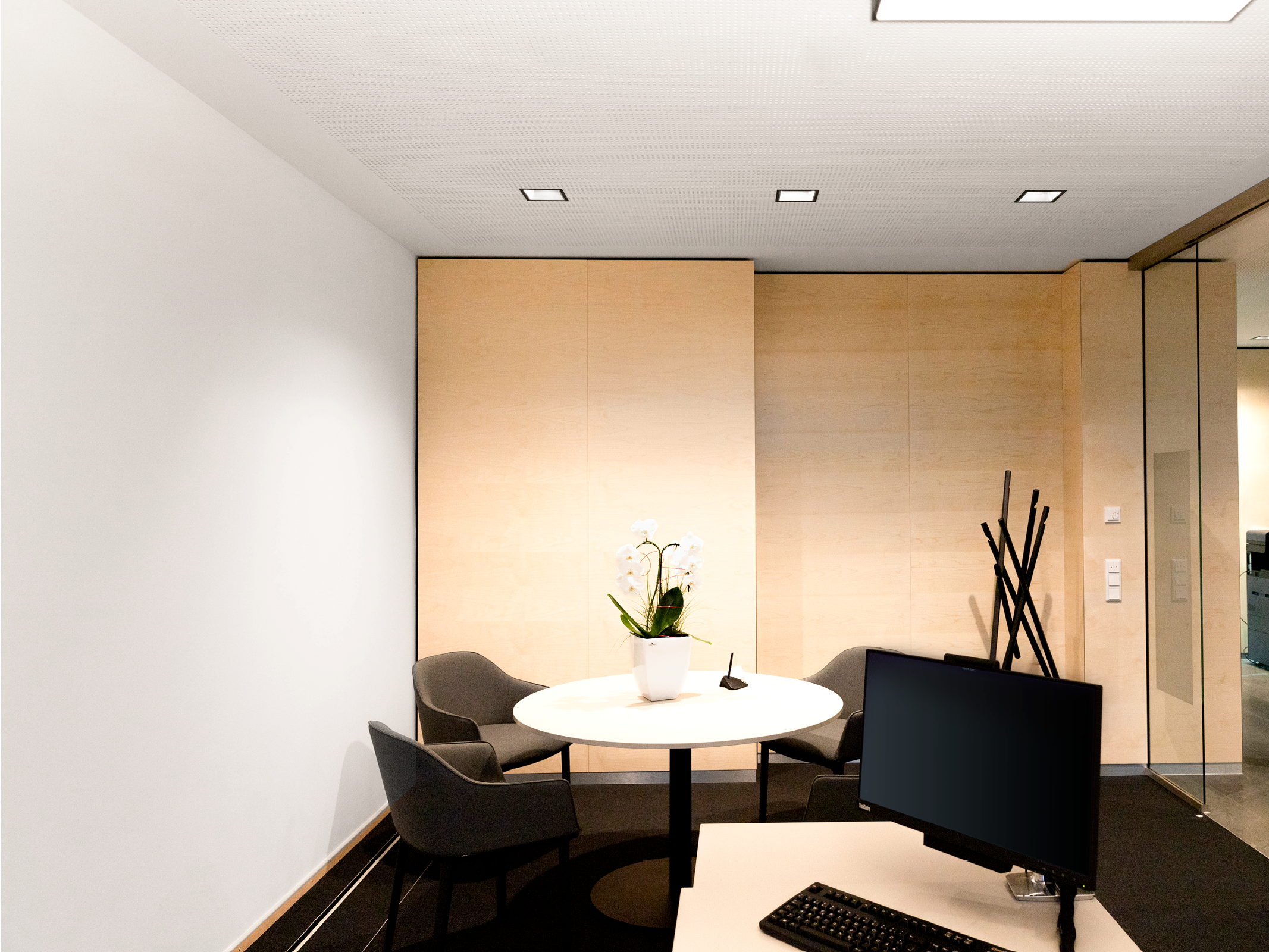 Für individuelle Beratungen stehen den Mitarbeitern vier Besprechungszimmer mit moderner Präsentationstechnologie zur Verfügung. Die Pendelleuchte Beam Me Up jr. von Lightnet setzt hier gestalterische Akzente. Der Leuchtenschirm aus einem hochwertig verarbeitetem Fiberglas beherbergt einen farblich abgesetzten dekorativen Reflektorring mit einer rückversetzten Lichtoptik für eine angenehme Allgemeinbeleuchtung mit maximalem Transmissionsgrad.