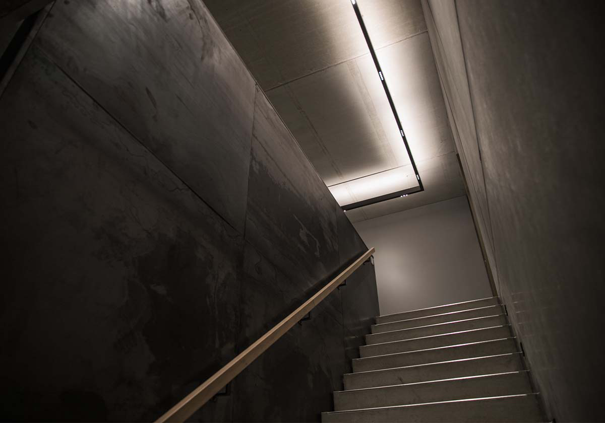 Das wegweisende Lichtkonzept im Eingangsbereich des Architekturbüros, umgesetzt mit Pendel- und Anbau- FUSION Linear LED-Profilen von NEKO Lighting, folgt der Form der Eingangshalle in Richtung Küche sowie des Treppenaufgangs. Über die gesamte Länge bietet das direkt-indirekt strahlende LED-Beleuchtungskonzept eine perfekte Ausleuchtung der Treppe und des Flures der ersten Etage.
