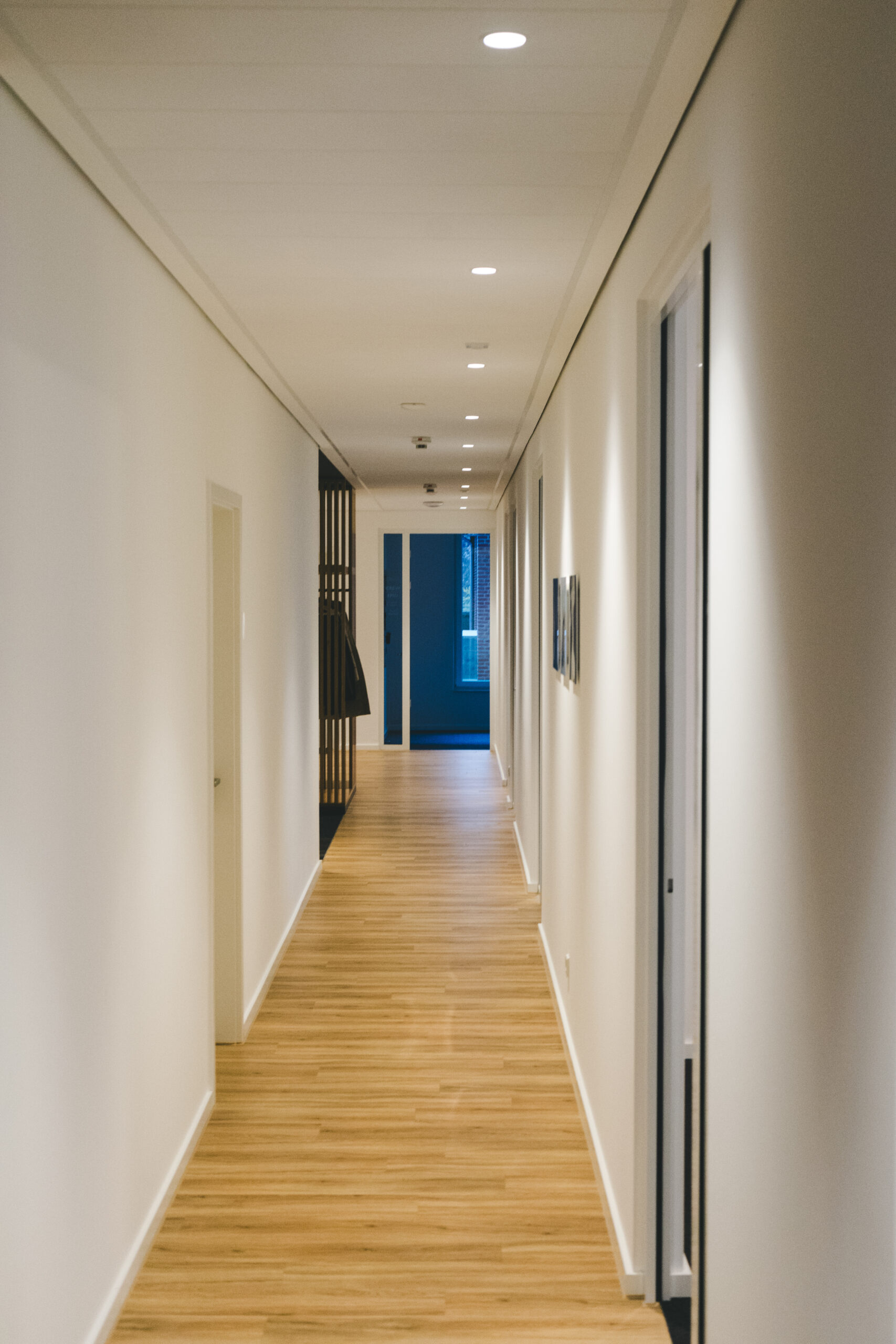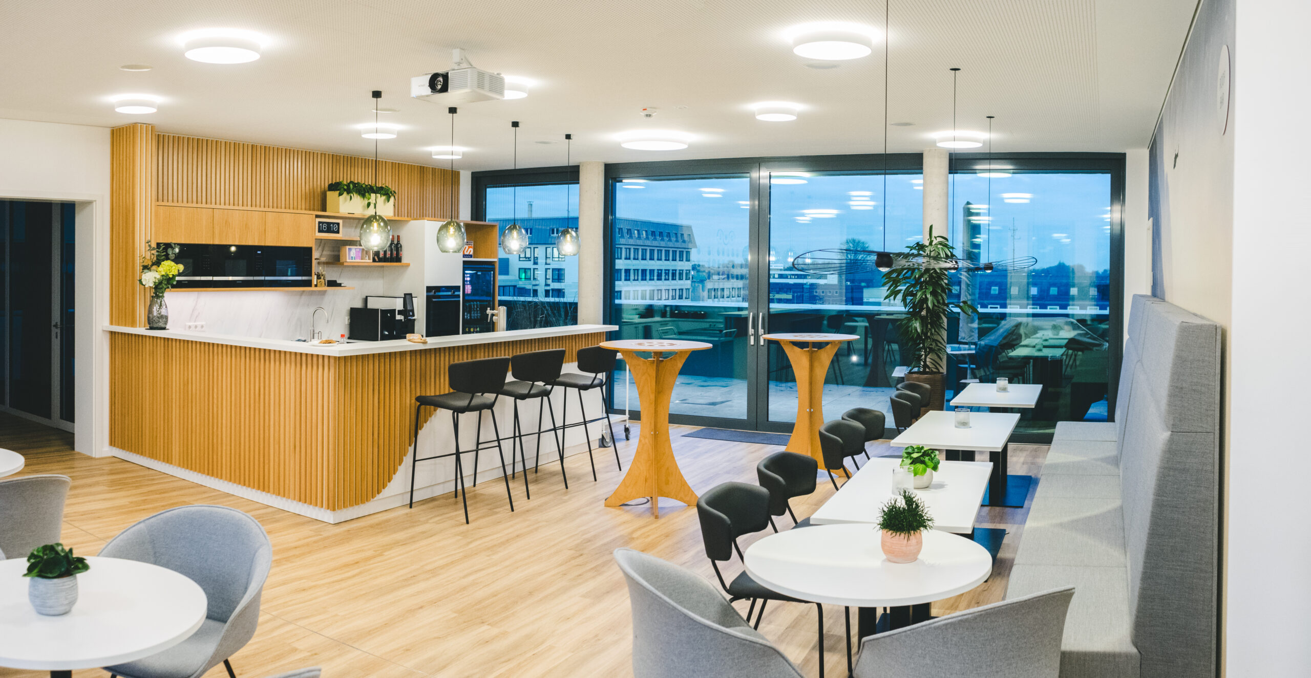 Nach ihrem Standortwechsel haben wir ein neues Beleuchtungskonzept umgesetzt, das das offene Treppenhaus des Gebäudes in ein bläuliches Licht taucht, perfekt abgestimmt auf die Corporate Identity.