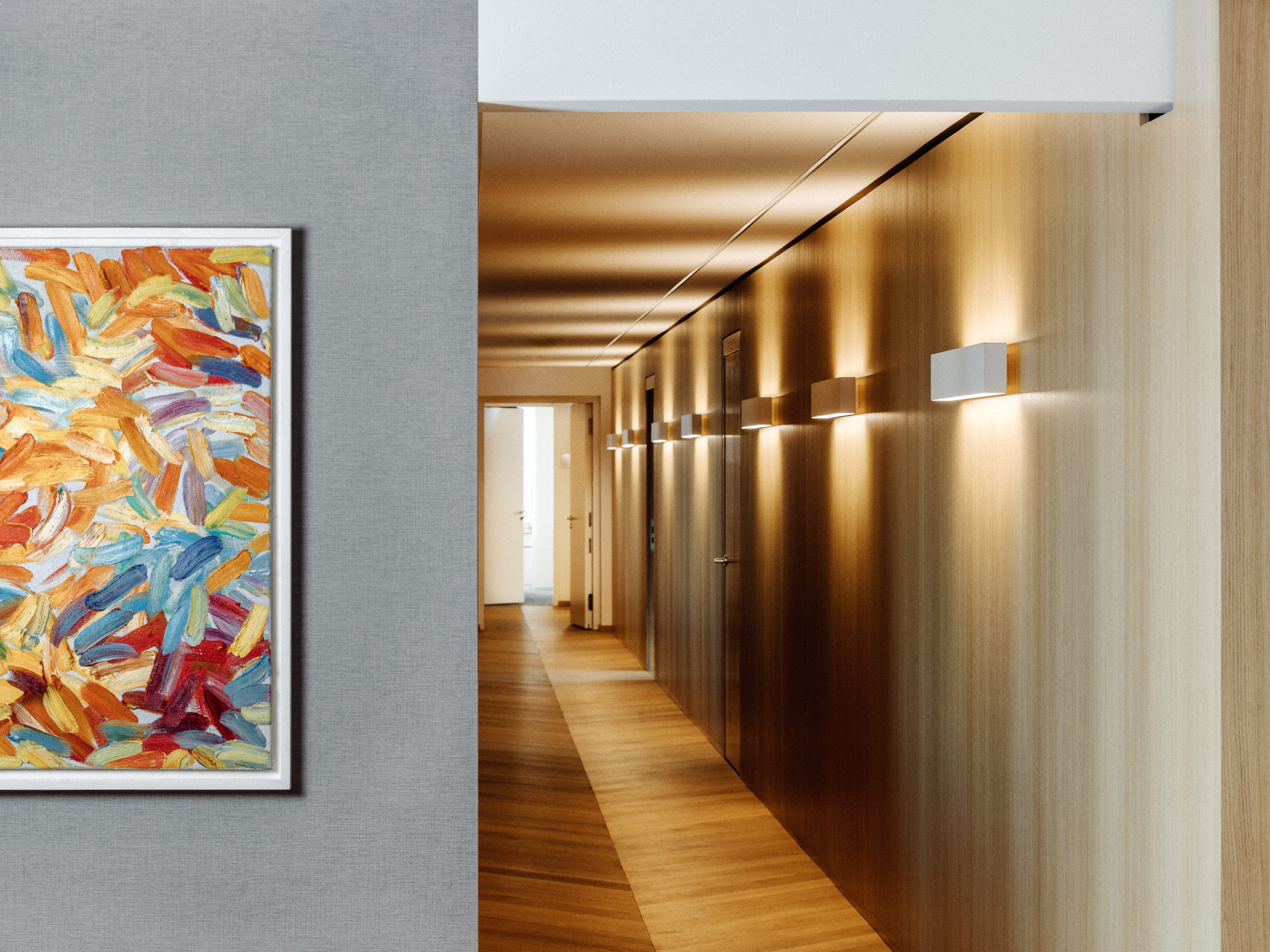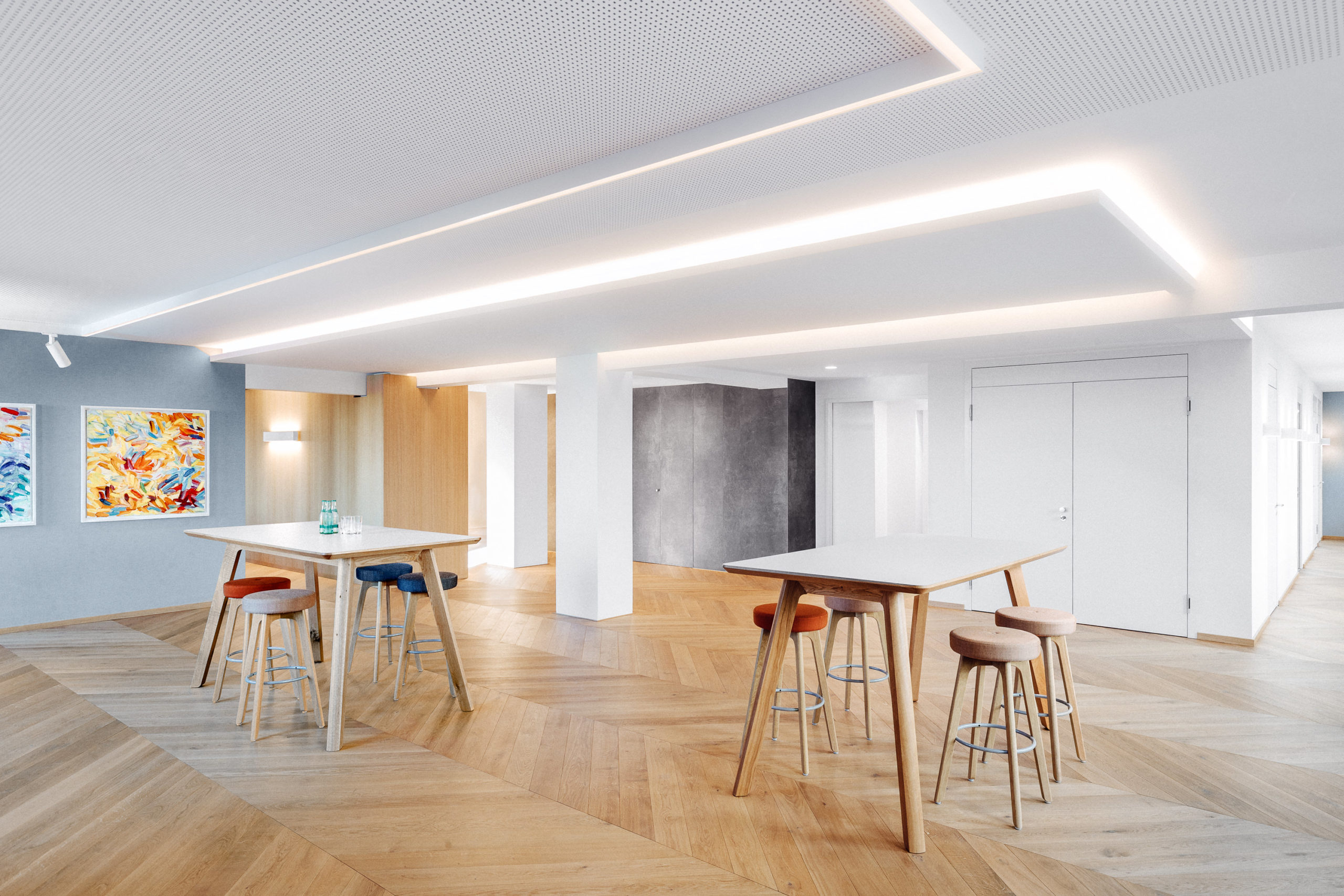 Während die klassischen Bankgeschäfte meist online erledigt werden, wird bei Vermögensberatung, Baufinanzierung und zur Firmenkundenbetreuung viel Wert auf persönliche Betreuung gelegt, die sich Zeit nimmt. Dazu wurden die modernen Beraterräume mit der notwendigen technischen Ausstattung versehen und beim Lichtkonzept setzen wir auf indirekte Beleuchtung mit Wand- und Stehleuchten.