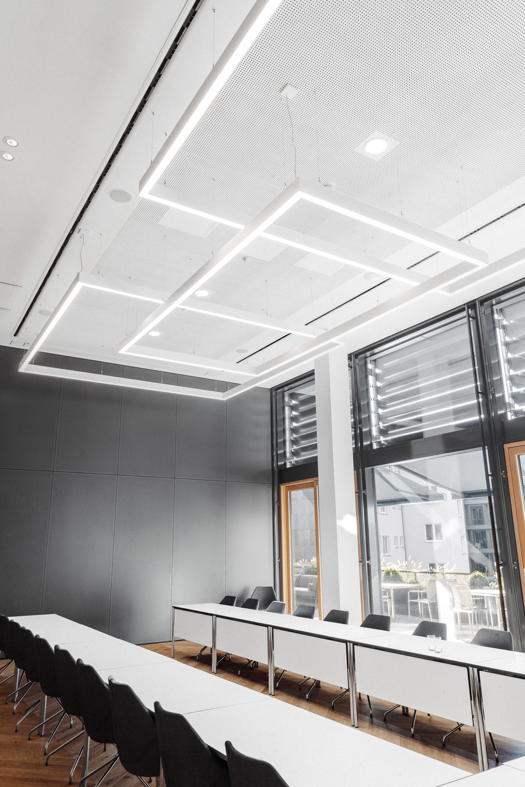 Im zweiten Obergeschoss wurde ein großzügiger Multifunktionsraum eingerichtet, der für Konferenzen, Tagungen und Vorträge für bis zu 120 Gäste ausgelegt ist. Beleuchtet wird er von Lightnet-Profilen. Die Leuchte Match von Vibia inszeniert den Vorraum zum großen Vortragsraum und ist in diesem Fall mehr als nur eine Lichtquelle. An dünnen Aluminiumstäben sind am Ende LEDs angebracht, wodurch die Leuchte nahezu frei konfiguriert werden kann und somit im Raum als eigenständiges Beleuchtungskunstwerk wirkt.