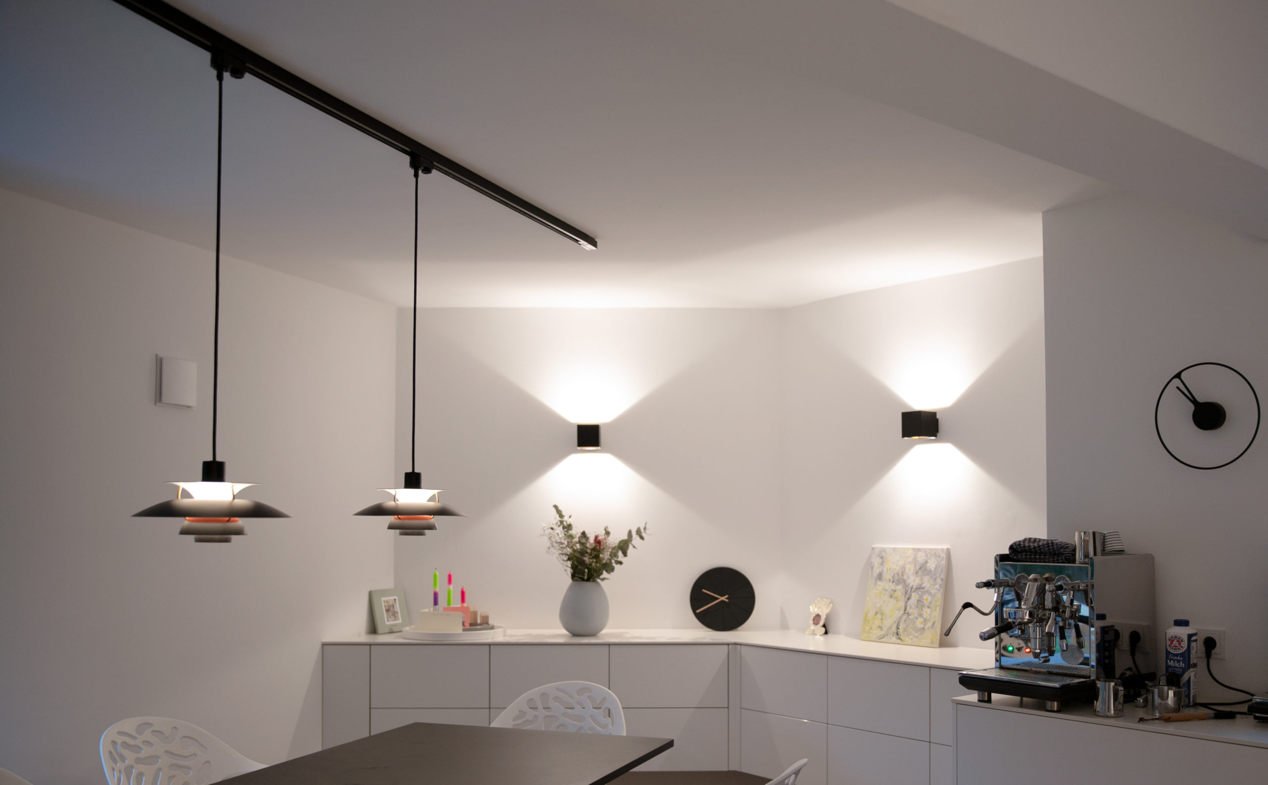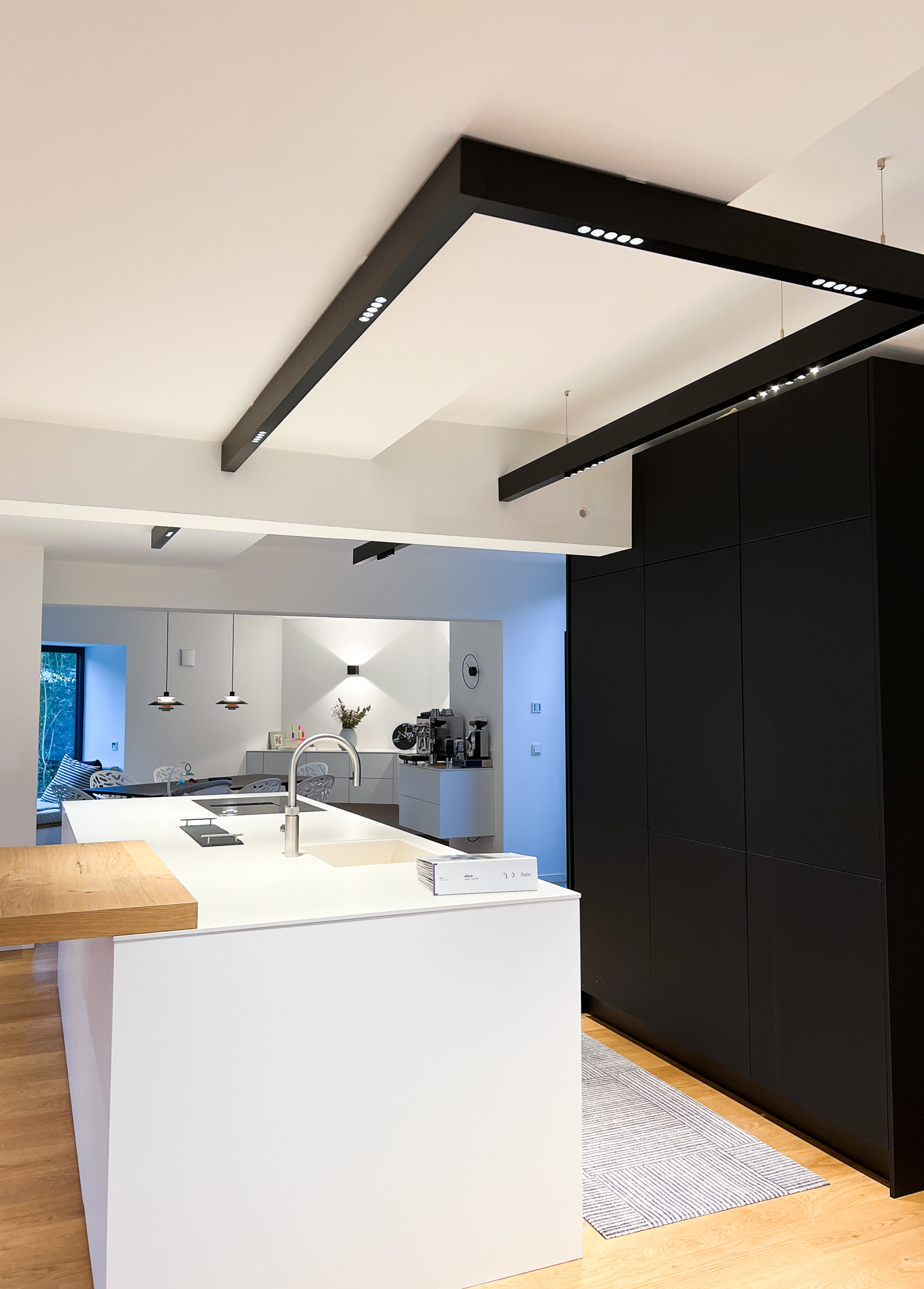 Eine zeitgemäße Küche verlangt ein flexibles und stilvolles Beleuchtungskonzept. Diese Merkmale bietet das modulare FUSION Linear System von NEKO Lighting. Der gezielt gesetzte Kontrast aus weißen Möbel und dem tiefschwarzen Gehäuse des linearen Profils geben der offenen Küche des Wohnhauses einen modernen Charakter. Durch den Höhenversatz der Decke kombinierten wir Pendel- und Anbauvariante des Profilsystems, um eine homogene Beleuchtung zu ermöglichen. In regelmäßigen Abständen wurden FUSION FF5 Downlights und FS6 Adjustable Spotlights in das Profilsystem eingesetzt, um den Küchenblock und die Arbeitsplatte optimal auszuleuchten. Das Linearsystem bietet unendlich viele freie Gestaltungsmöglichkeiten, die nachträglich werkzeuglos veränderbar sind.