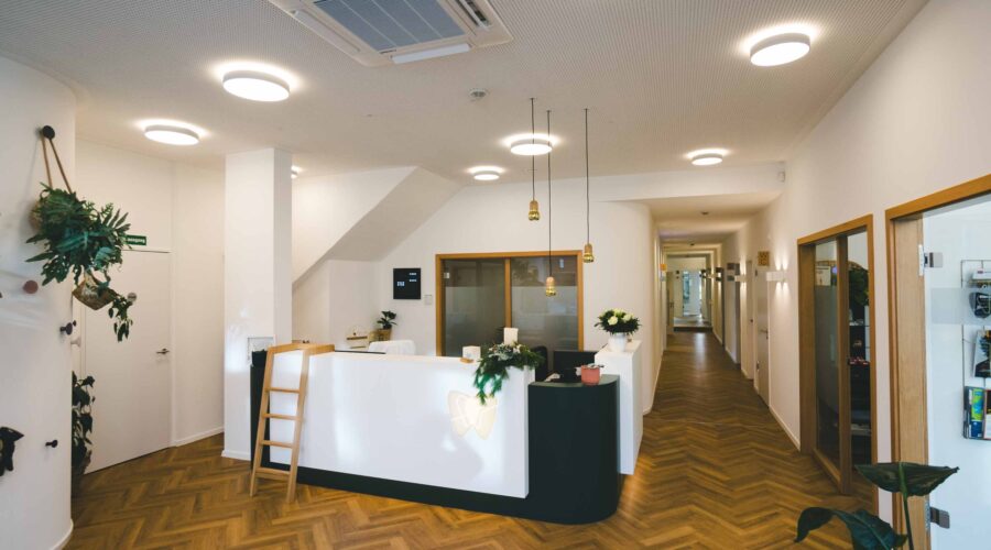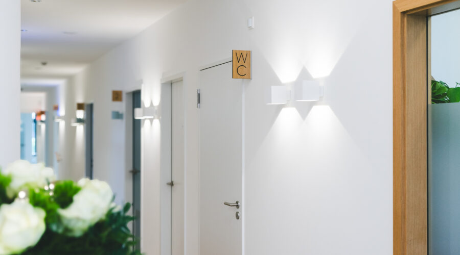 Die Atmosphäre ist einladend, warm und stilvoll ist und daher ist unser Beleuchtungskonzept darauf ausgelegt, den Ärzt*innen und Helfer*innen ein professionelles Arbeitsumfeld mit ausreichender Beleuchtung zu bieten, aber auch die Patienten*innen durch einladendes Licht willkommen zu heißen.